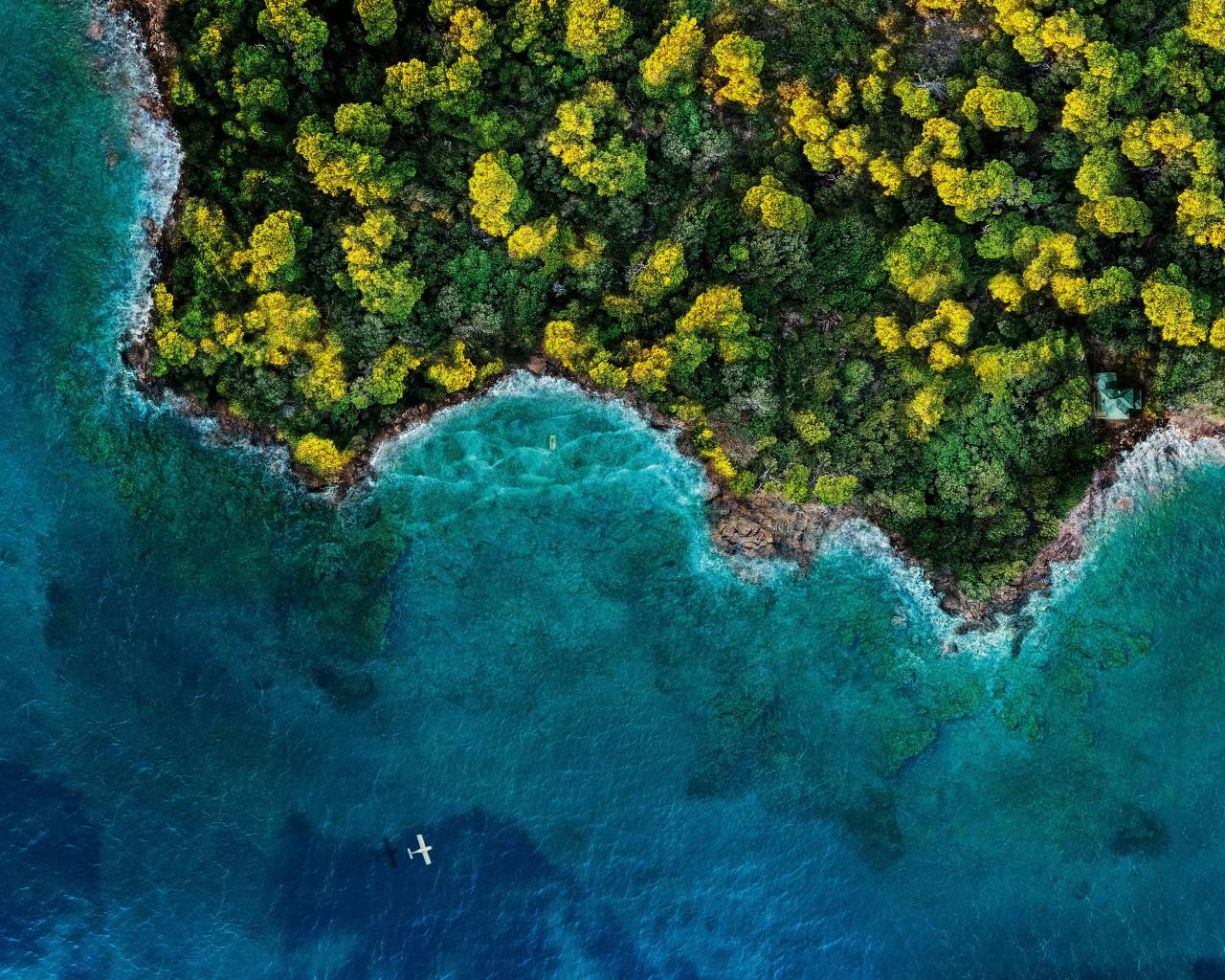 Wallpaper Top view of the blue ocean and green forest, Iceland