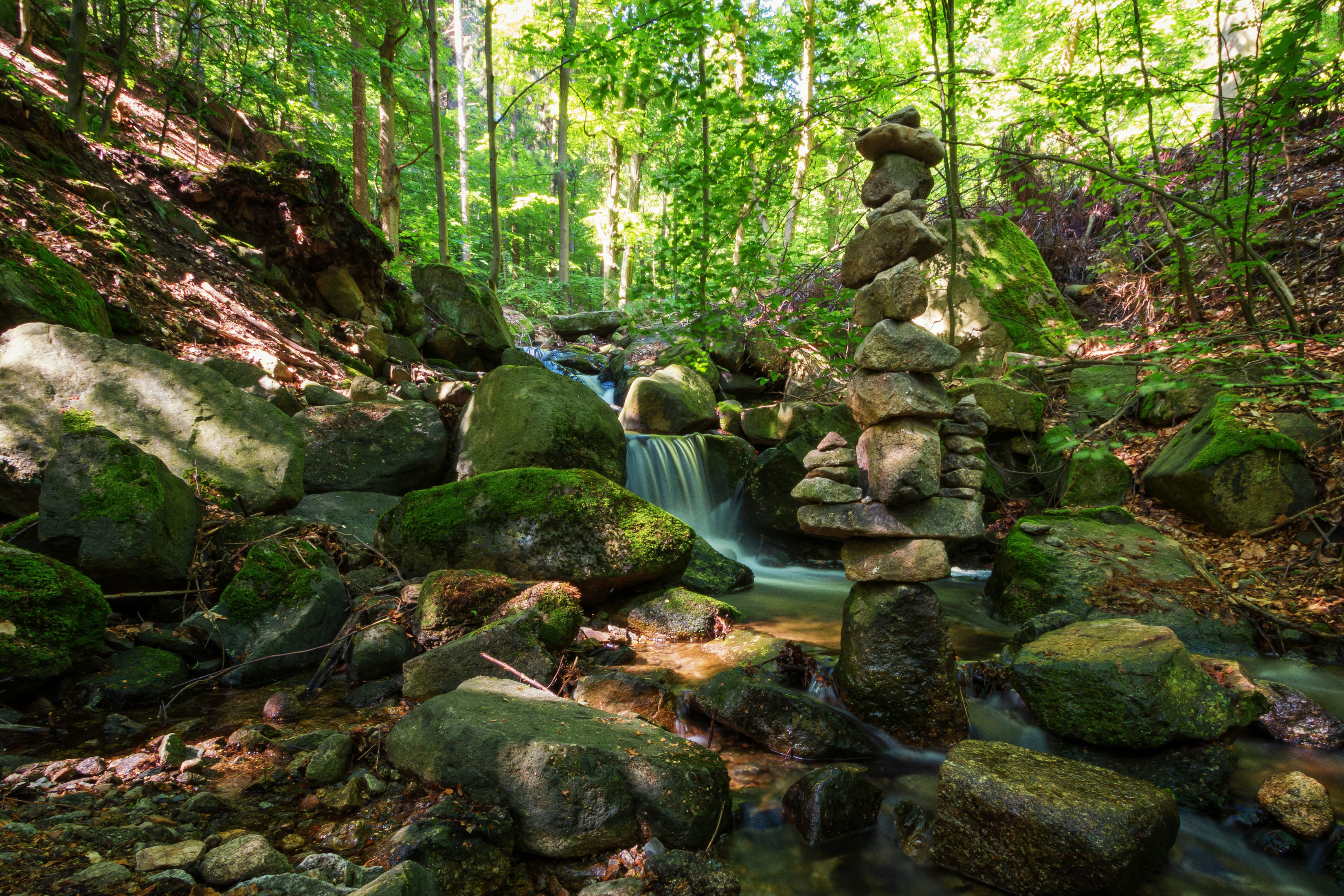 Wallpaper Water flows down moss-covered stones