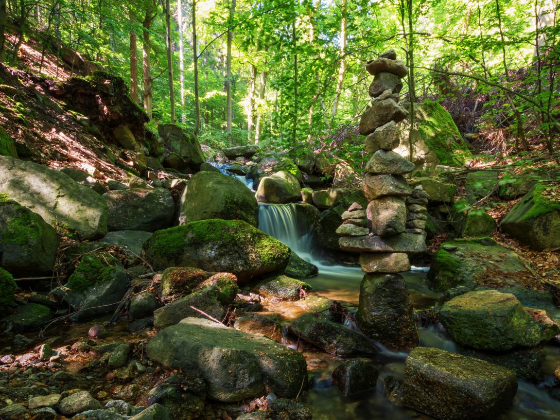 Wallpaper Water flows down moss-covered stones