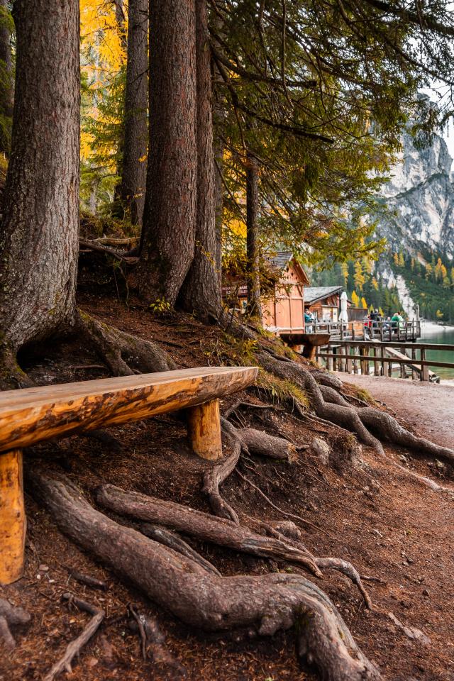 Wallpaper Bench by the trees in the park by the lake in the mountains