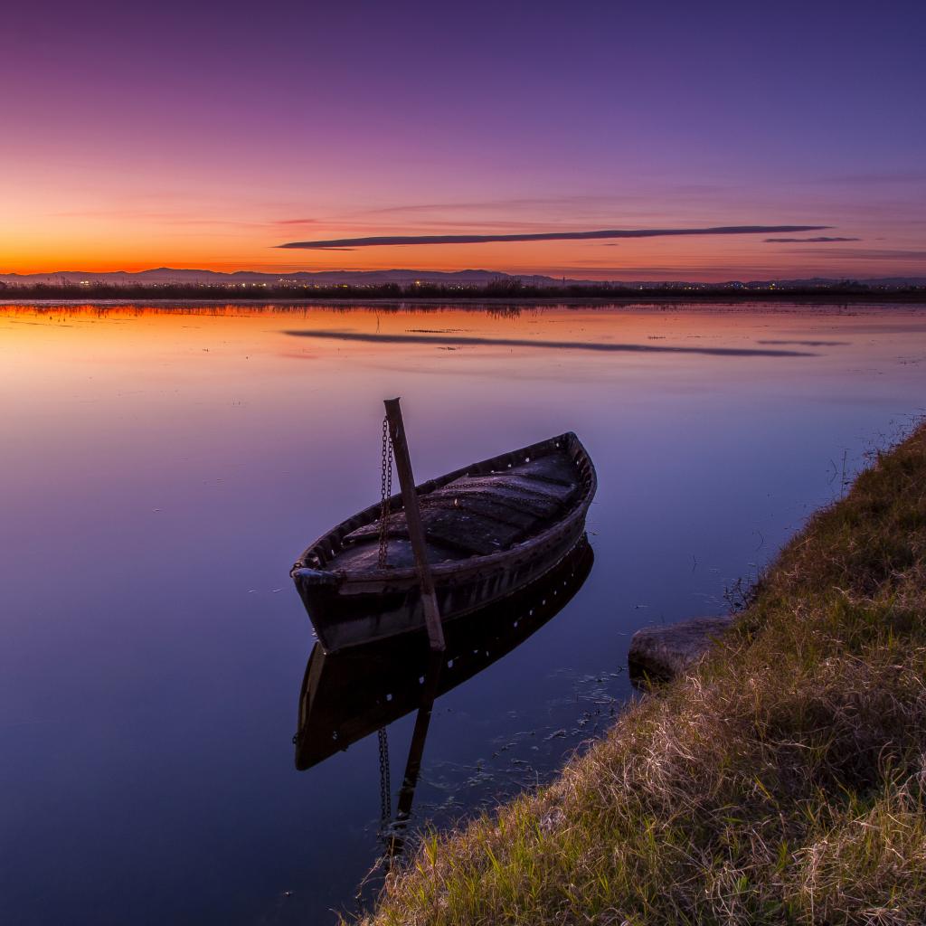 Wallpaper An old boat stands in the water at sunset