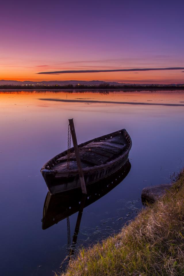Wallpaper An old boat stands in the water at sunset