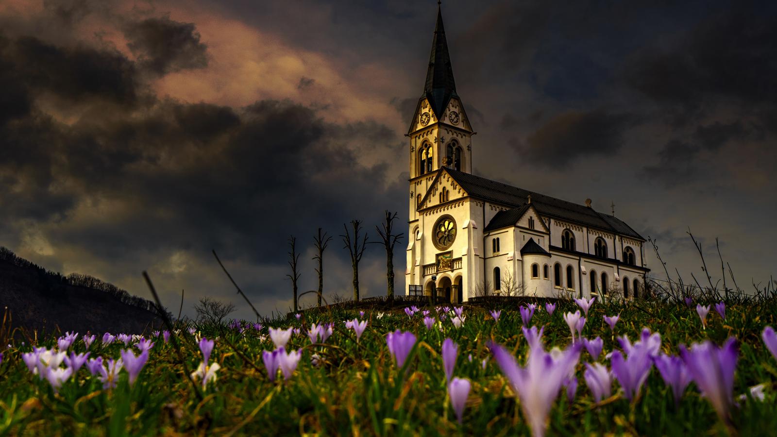 Wallpaper An old chapel stands on a hill with flowers