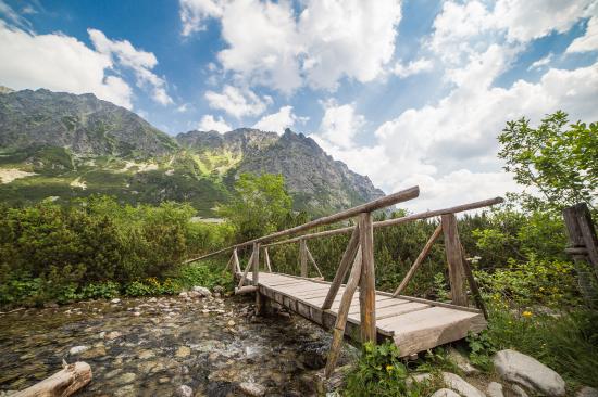 Wallpaper Old wooden bridge over a small river on a background of mountains
