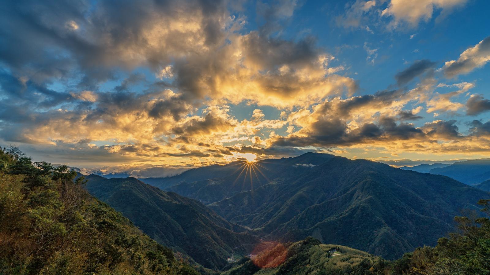 Wallpaper Dawn of the sun in the cloudy sky over the mountains
