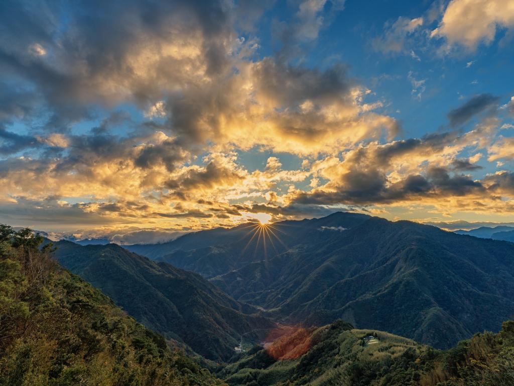 Wallpaper Dawn of the sun in the cloudy sky over the mountains