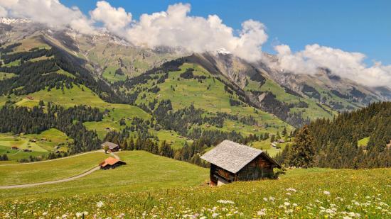Wallpaper House on a green hill in the mountains under white clouds
