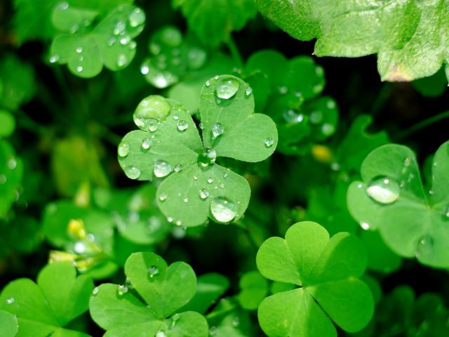 Wallpaper Green clover leaves in drops of water
