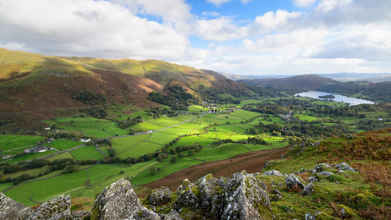 Wallpaper View of green hills under a blue sky with white clouds in summer