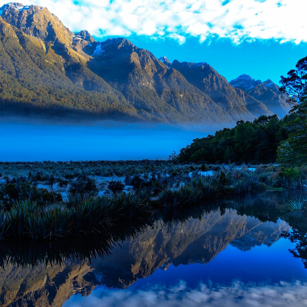 Wallpaper Mountains and sky are reflected in the blue water of the lake.