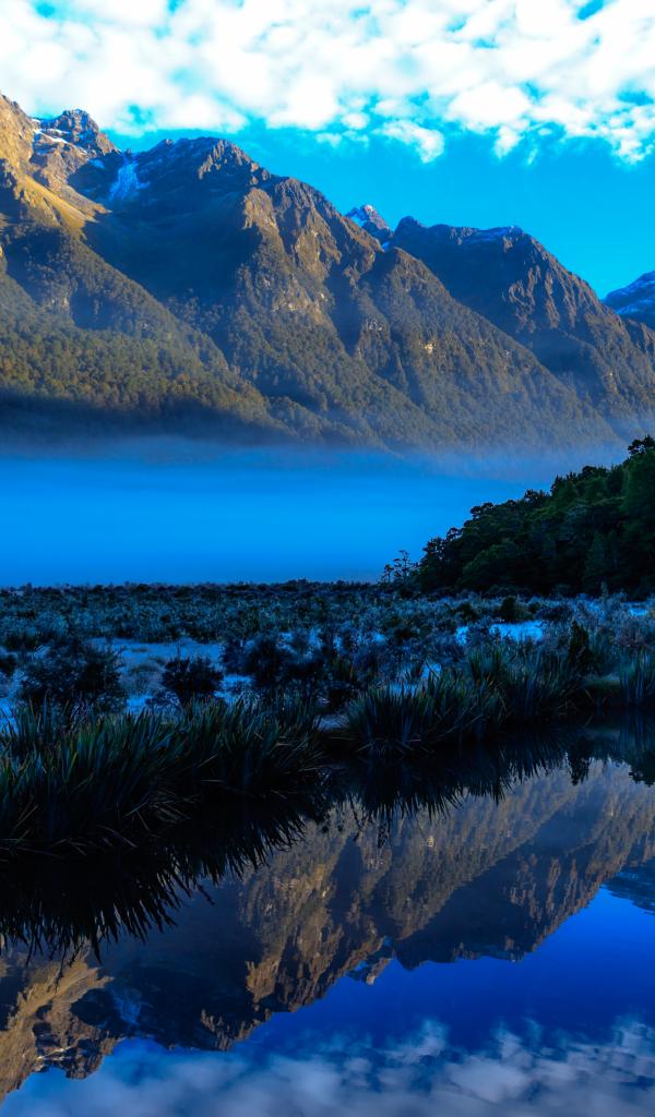 Wallpaper Mountains and sky are reflected in the blue water of the lake.