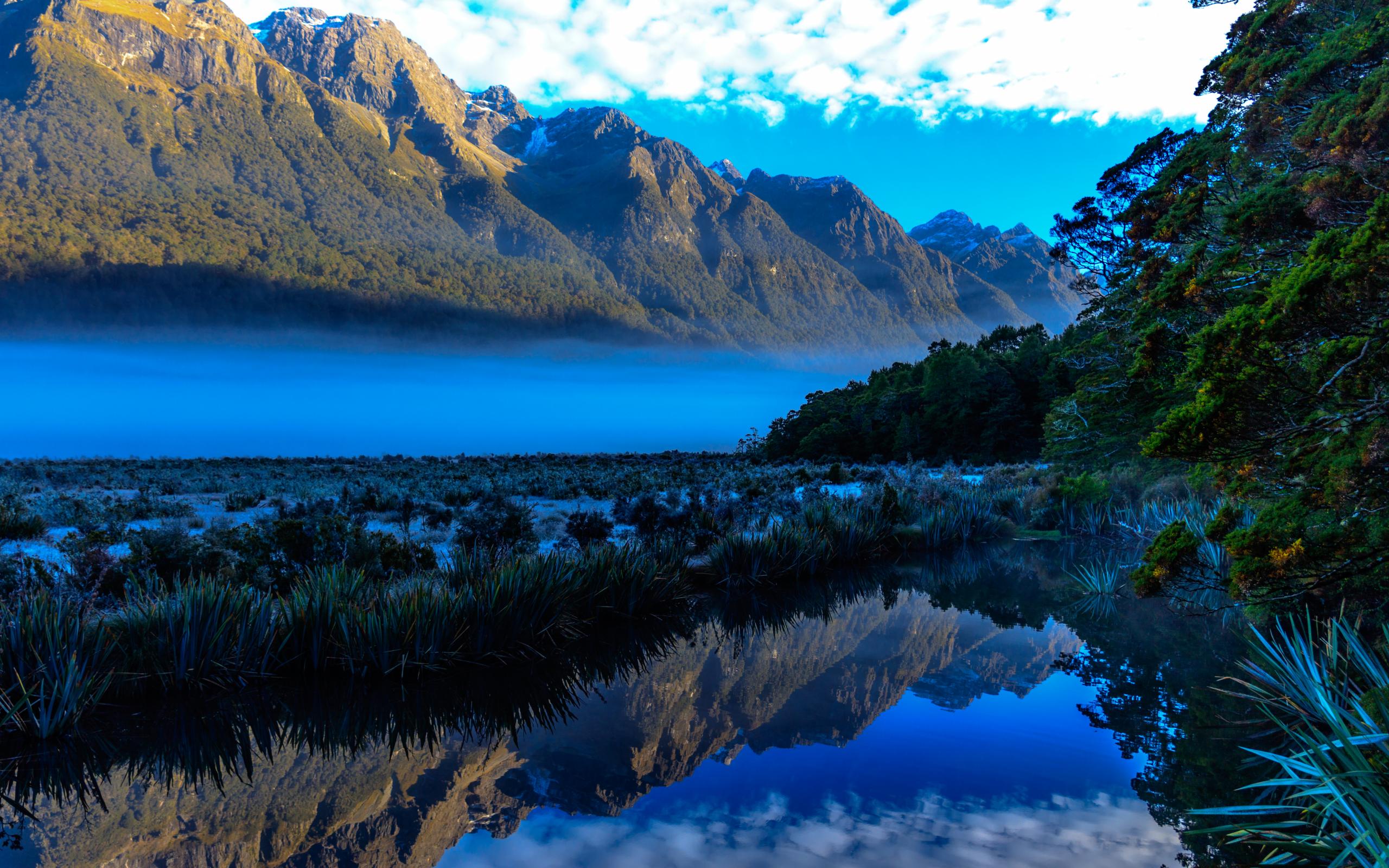 Wallpaper Mountains and sky are reflected in the blue water of the lake.