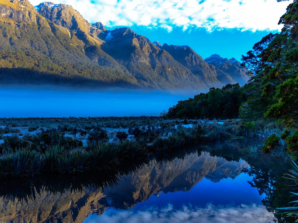 Wallpaper Mountains and sky are reflected in the blue water of the lake.