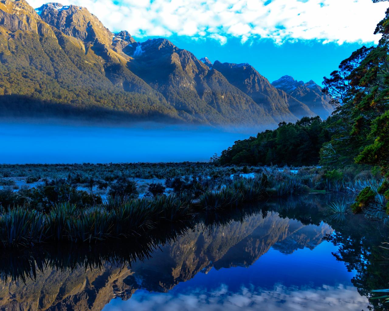 Wallpaper Mountains and sky are reflected in the blue water of the lake.