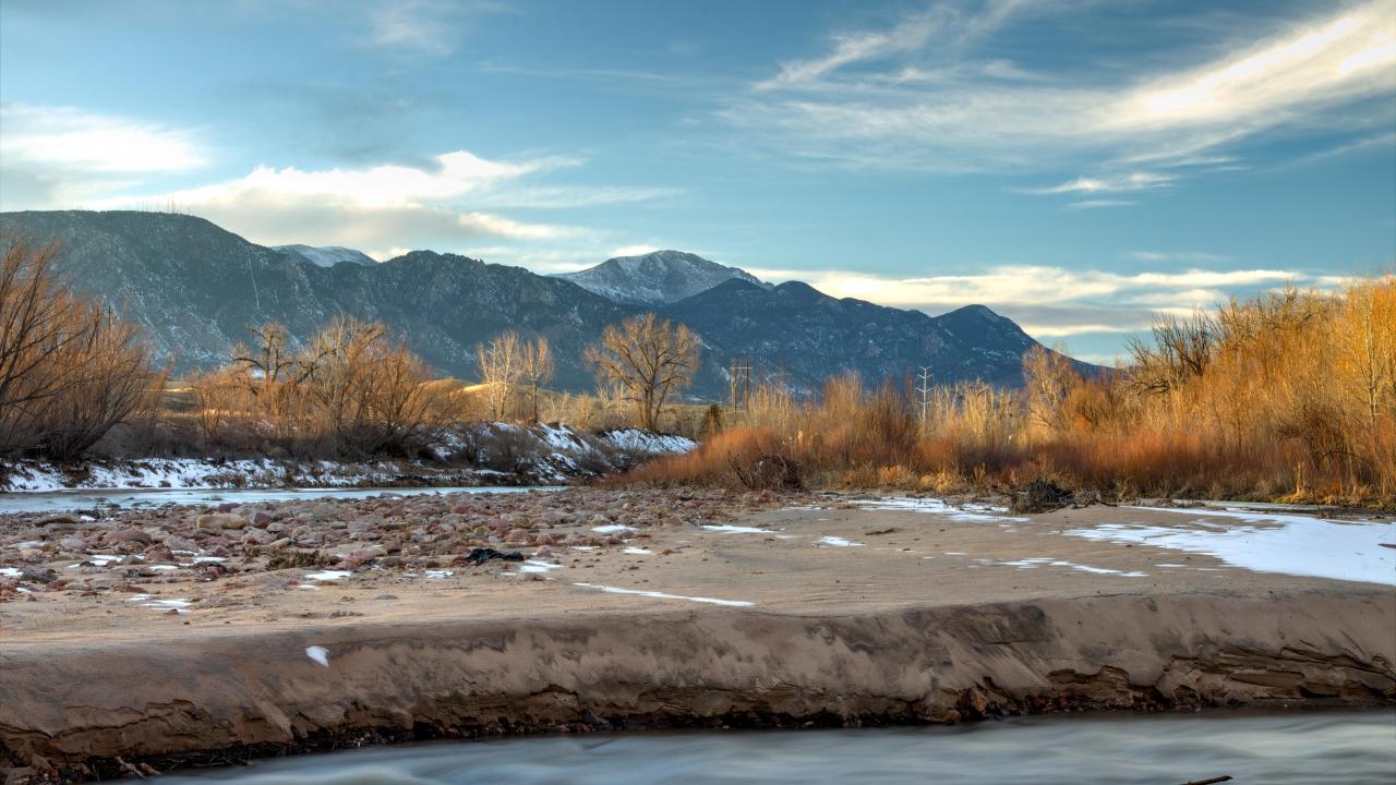 Wallpaper Stone river bank on a background of mountains under a blue sky