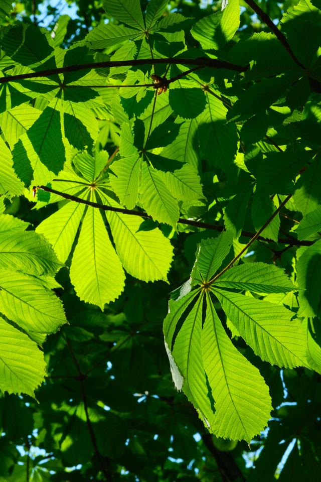 Wallpaper The sun breaks through the green leaves of a chestnut