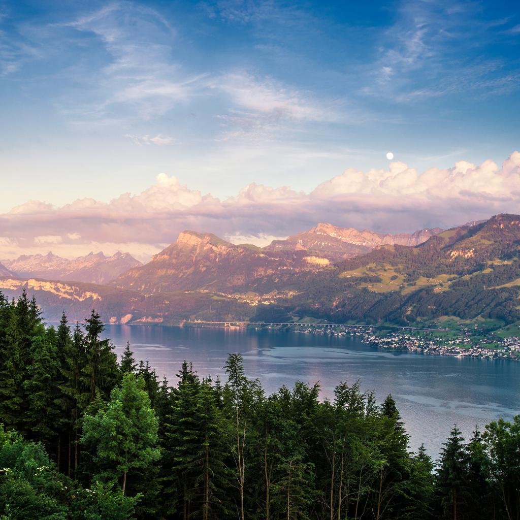 Wallpaper Beautiful view of coniferous forest and mountain lake under blue sky