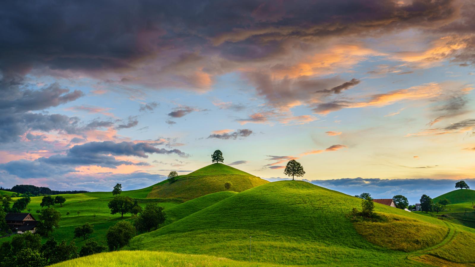 Wallpaper Green hills with trees under the sky with thunderclouds