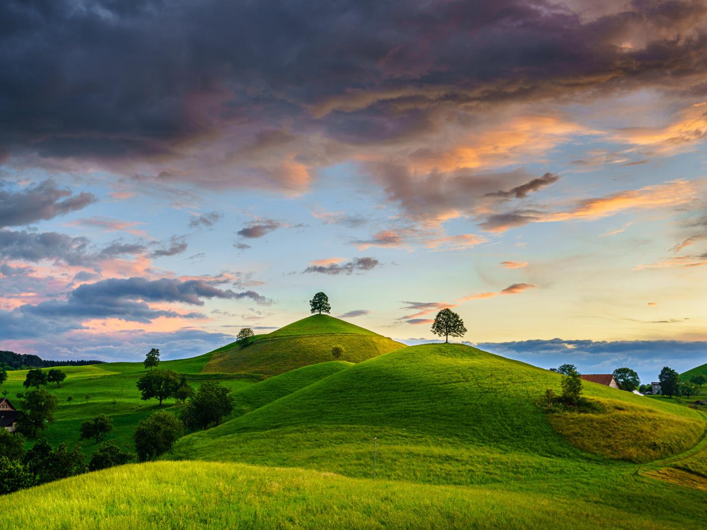 Wallpaper Green hills with trees under the sky with thunderclouds