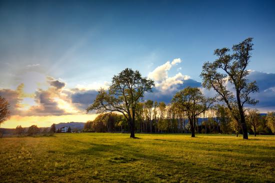 Wallpaper Green trees and grass in the park at sunrise