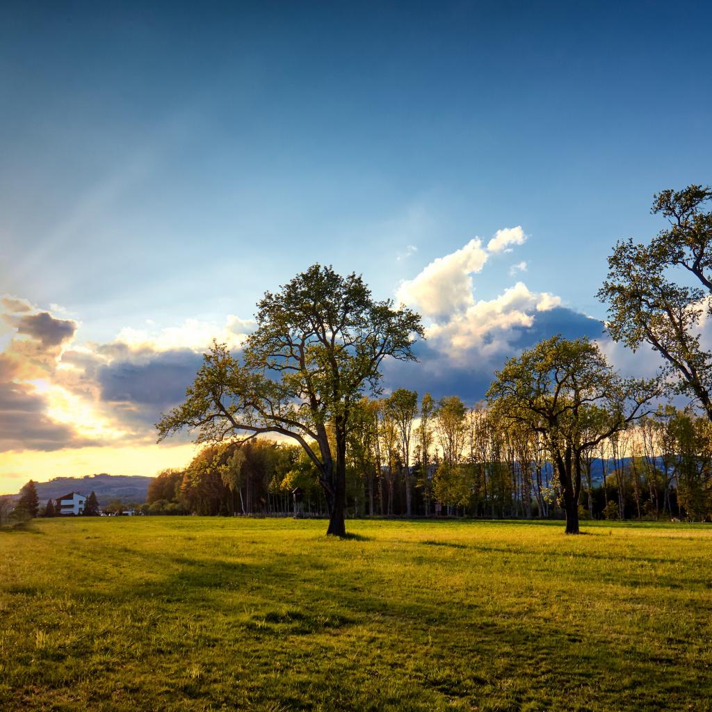 Wallpaper Green trees and grass in the park at sunrise