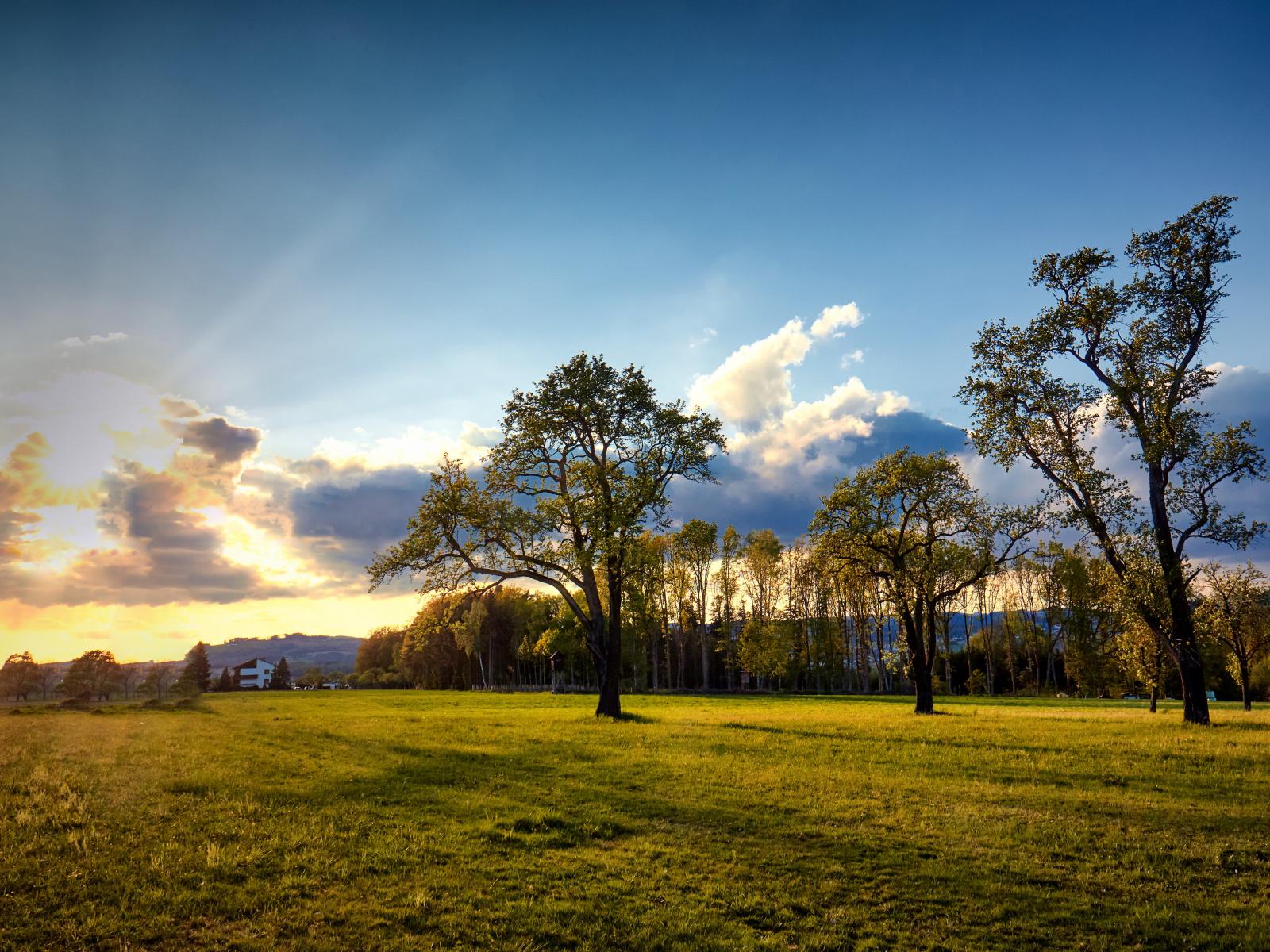 Wallpaper Green trees and grass in the park at sunrise