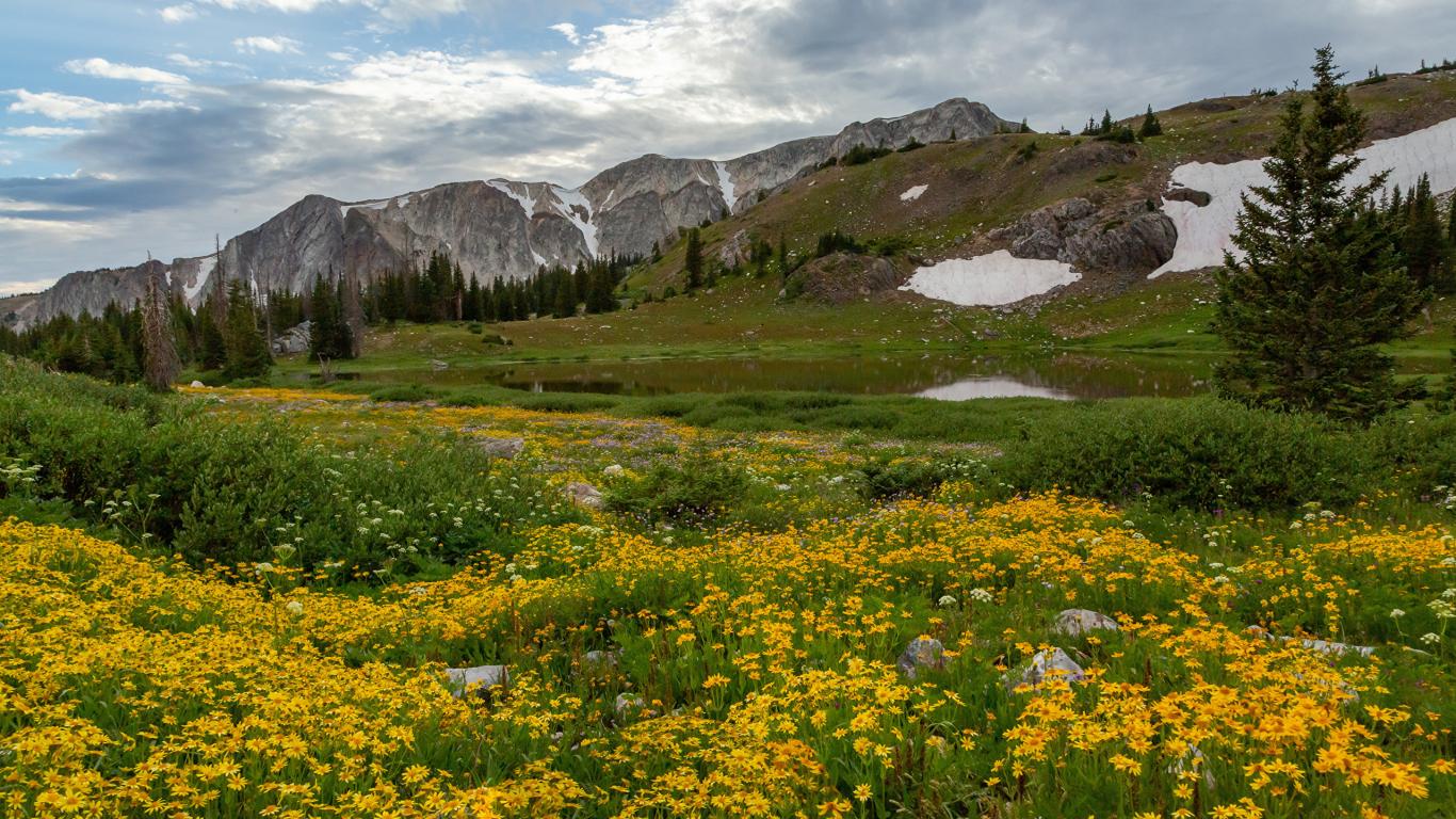Wallpaper Yellow flowers on the banks of the river near the mountains