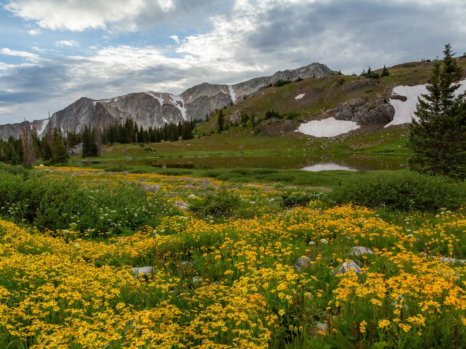 Wallpaper Yellow flowers on the banks of the river near the mountains