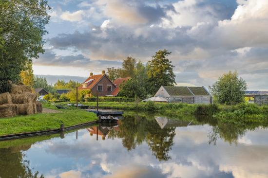 Wallpaper Houses are reflected in the river under the sky with white clouds