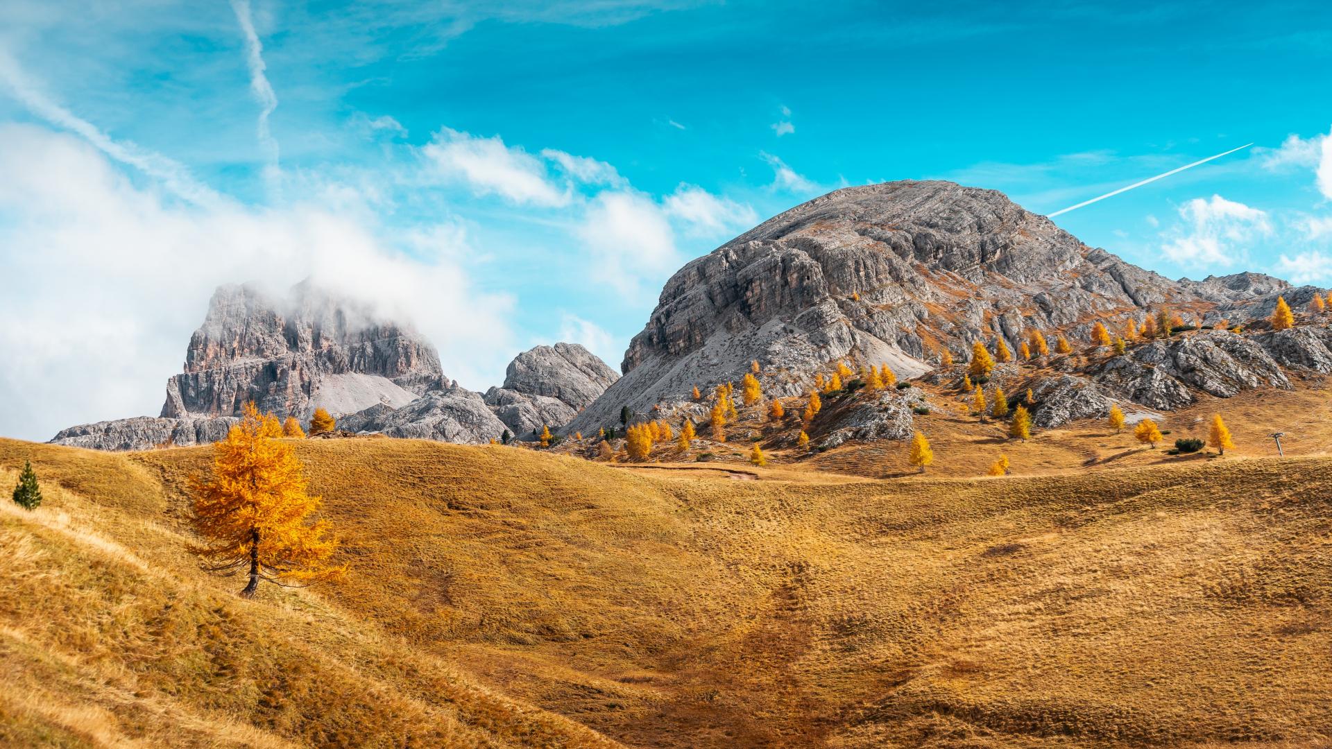 Wallpaper Hills with dry grass near the mountains under the blue sky