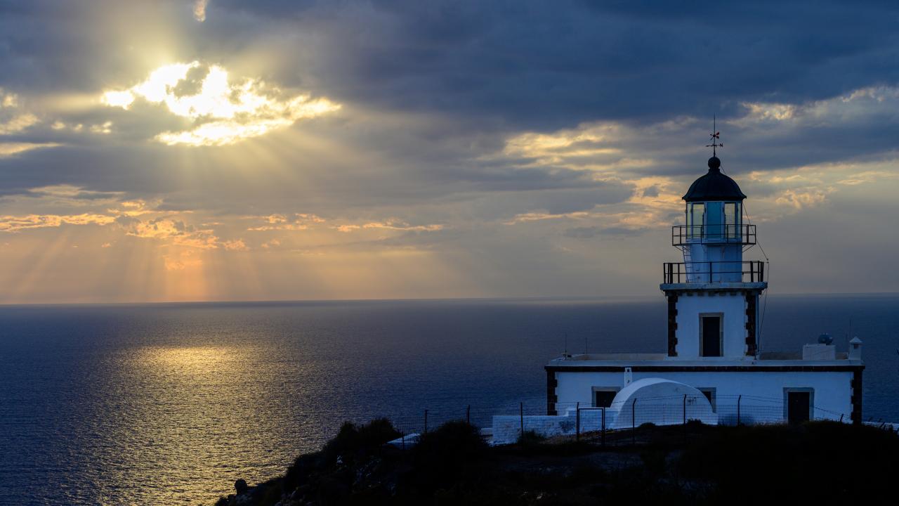 Wallpaper White lighthouse on the beach in the sun by the sea