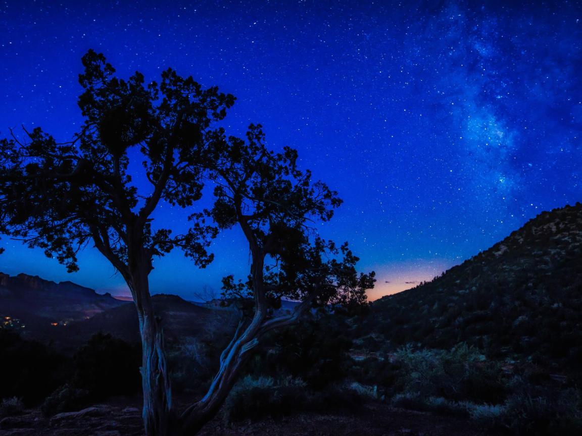Wallpaper Tree by the hill under the blue starry sky at night