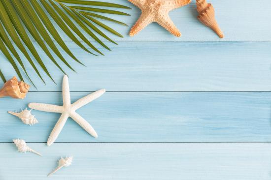 Wallpaper Palm leaf on table with seashells and starfish