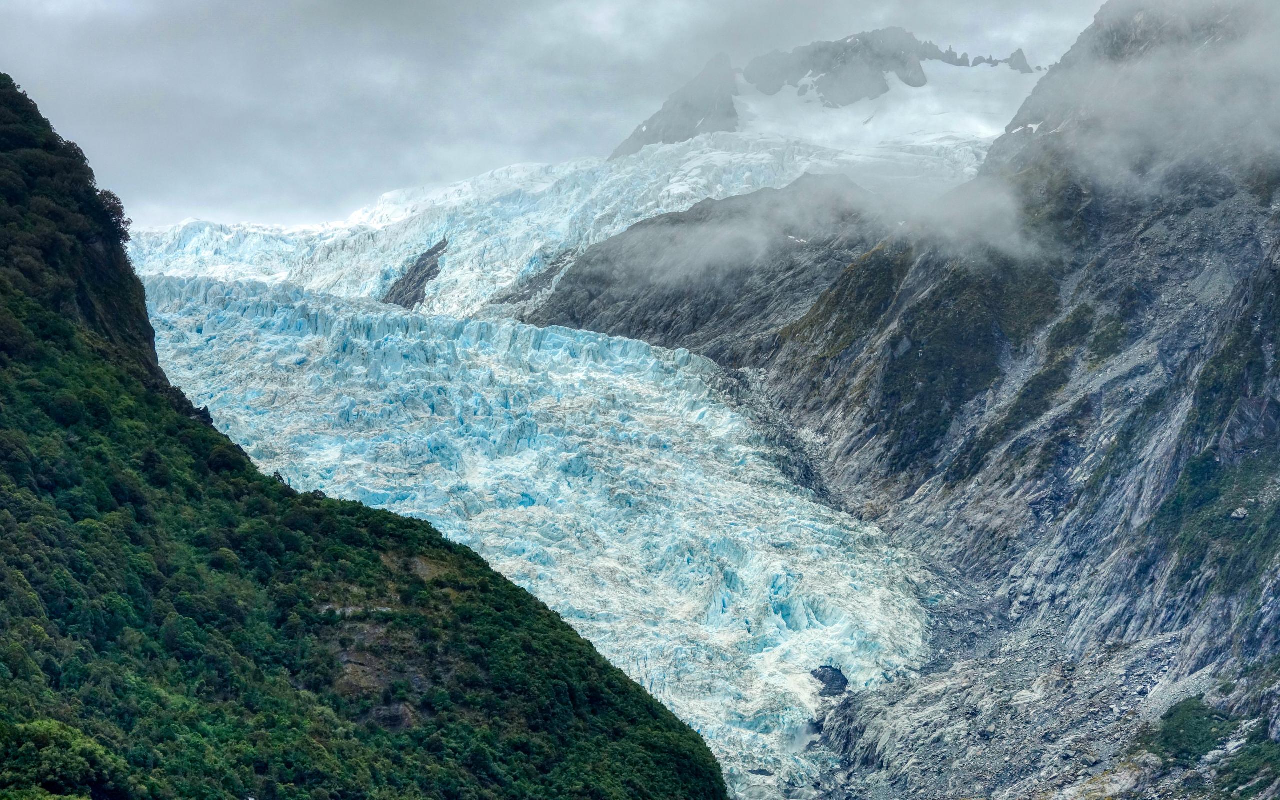 Wallpaper Blue glacier between rocks under stormy sky