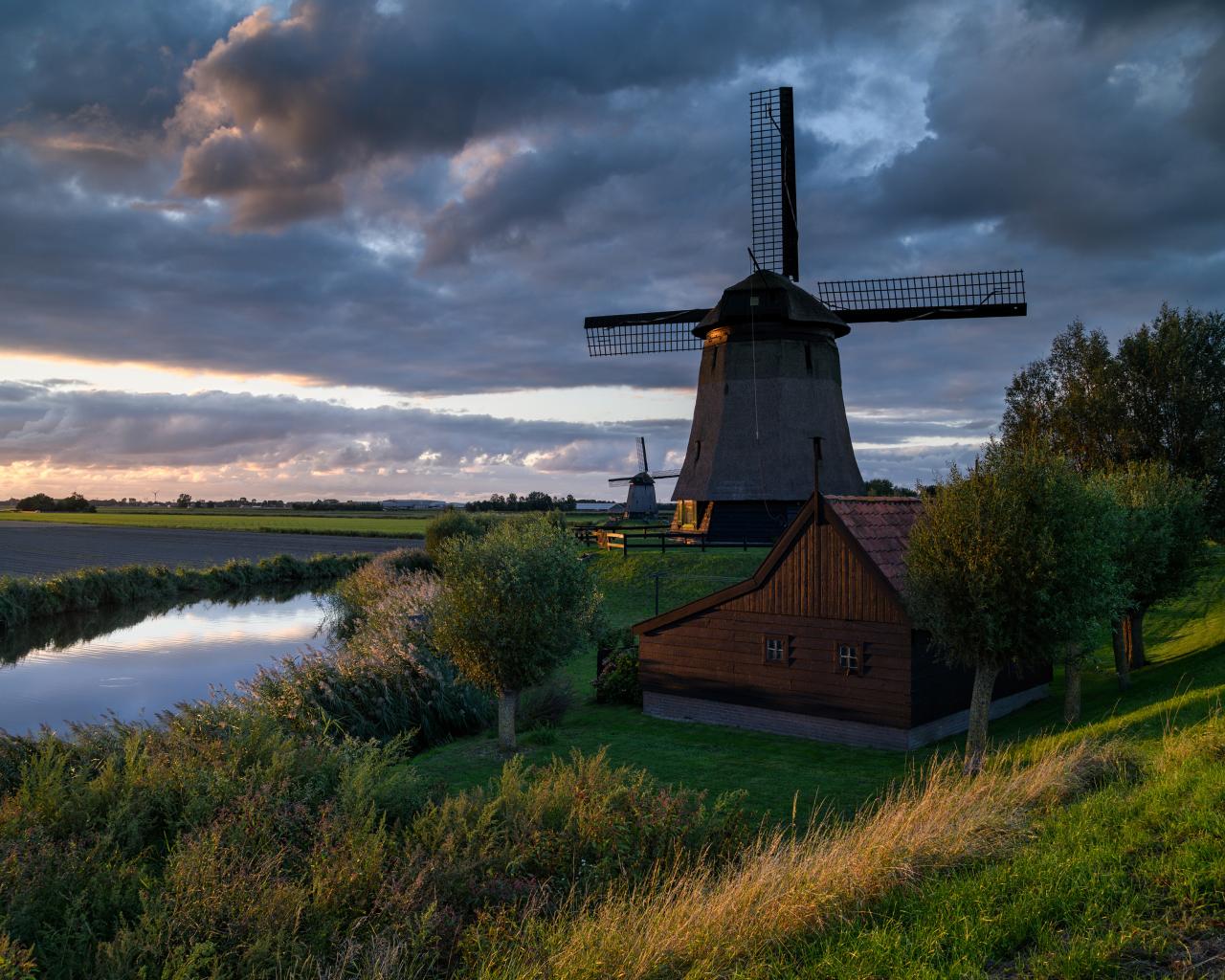 Wallpaper Large windmill by the river at sunset