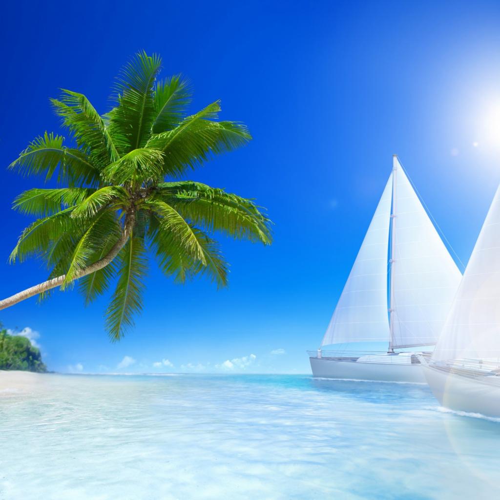 Wallpaper White sailboats in the sun at the beach