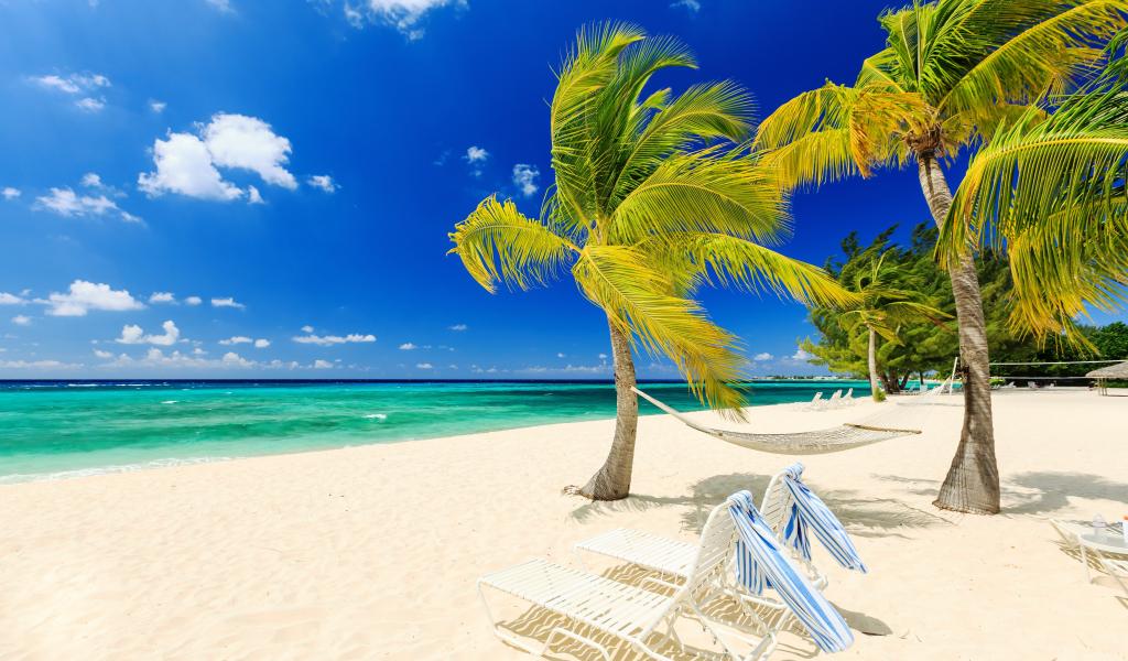 Wallpaper Sun beds and palm trees by the sea on a white sand beach
