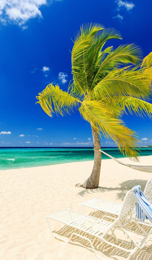 Wallpaper Sun beds and palm trees by the sea on a white sand beach