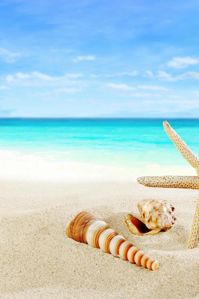 Wallpaper Shells and umbrella on a tropical beach