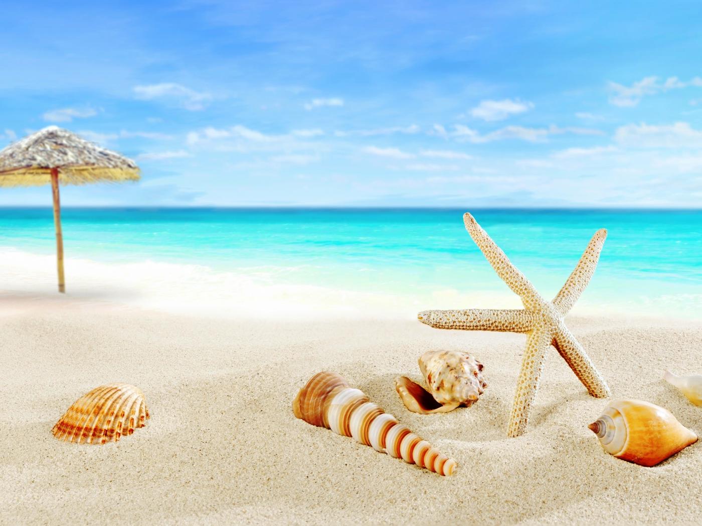 Wallpaper Shells and umbrella on a tropical beach