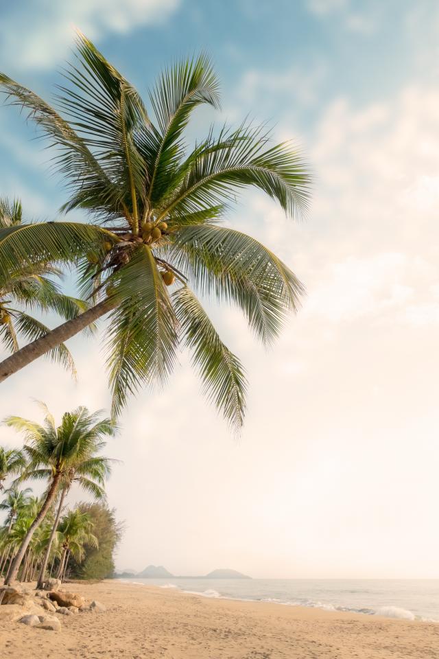 Wallpaper Green palm trees with rocks on the shore of the ocean in summer