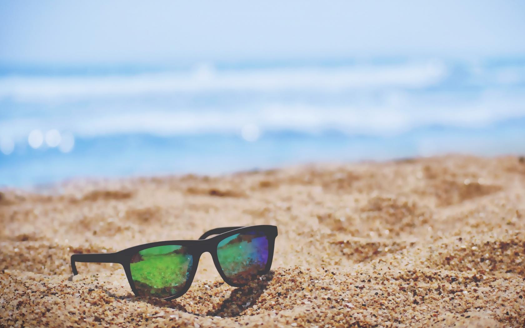 Wallpaper Sunglasses lie on the yellow sand near the sea