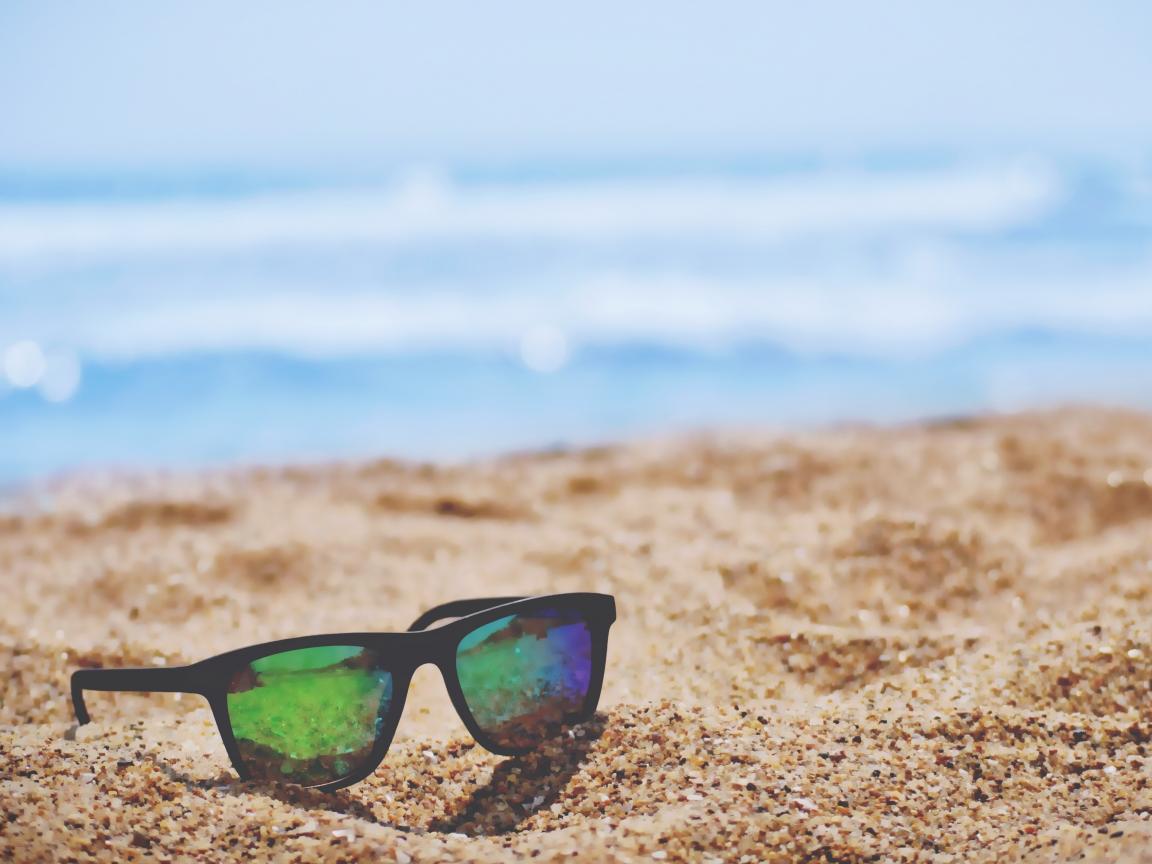 Wallpaper Sunglasses lie on the yellow sand near the sea