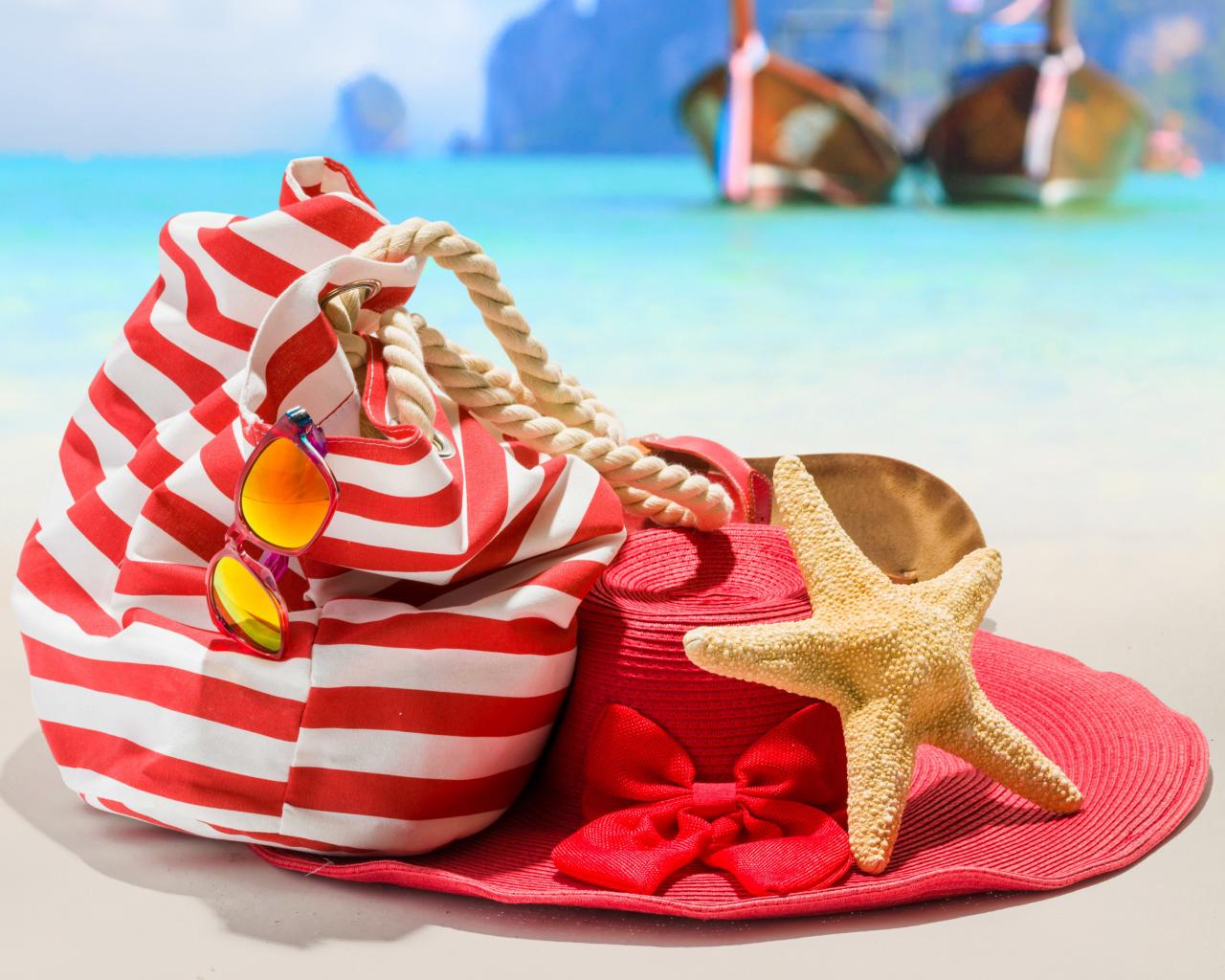 Wallpaper Big red hat with bag and starfish on the beach