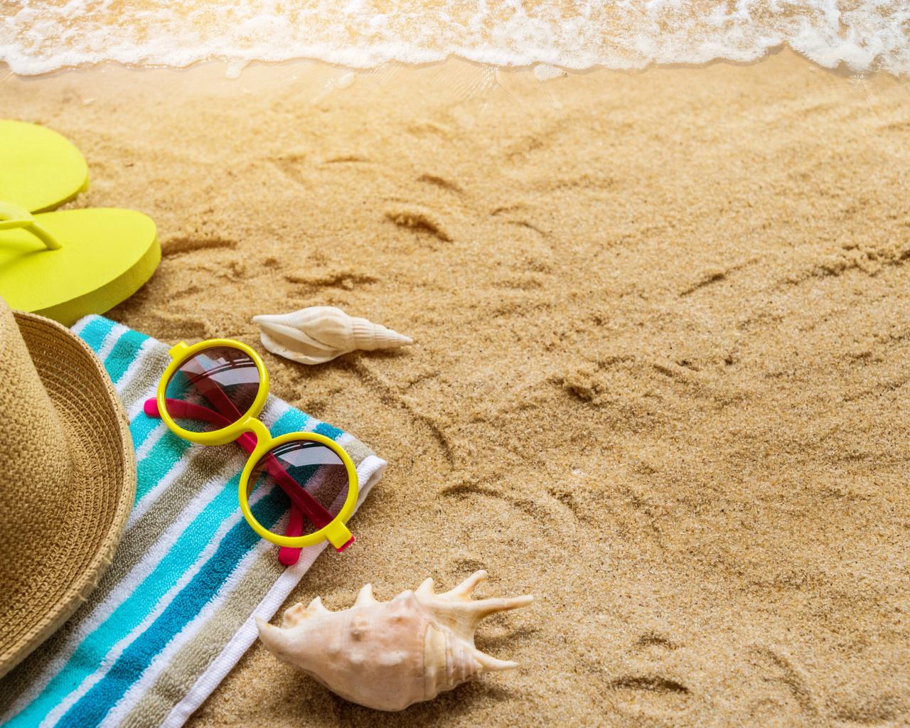 Wallpaper Hat, glasses, towel and shells on the yellow sand by the sea