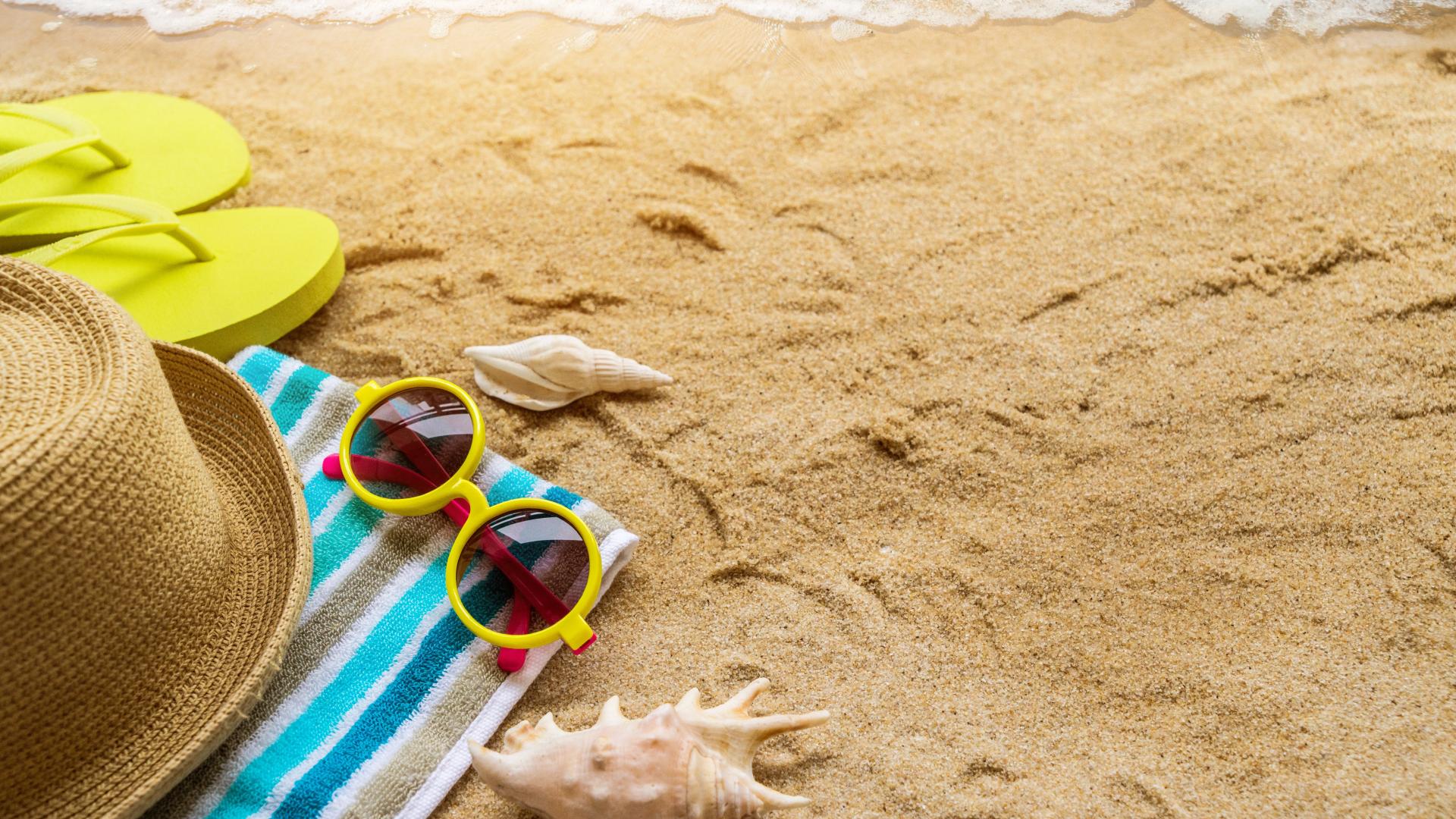 Wallpaper Hat, glasses, towel and shells on the yellow sand by the sea