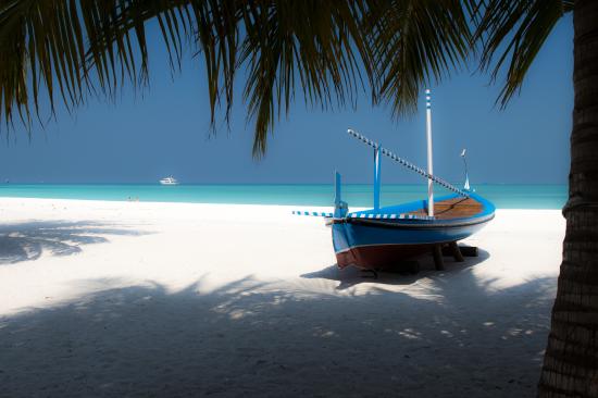 Wallpaper Boat on the white sand by the ocean in the tropics