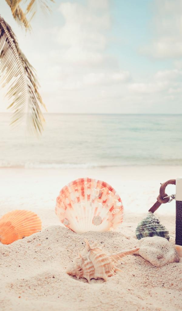 Wallpaper The camera on the beach with shells by the sea