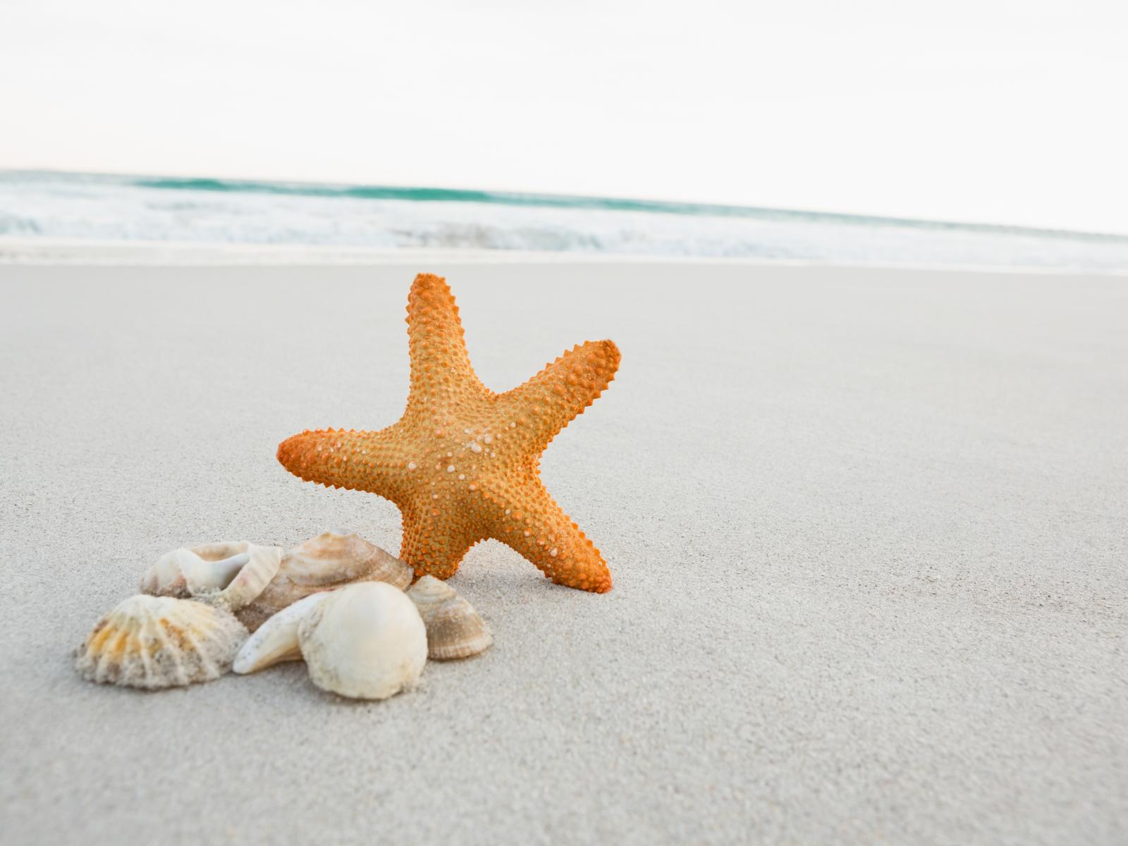 Wallpaper Starfish on the sand with shells by the sea
