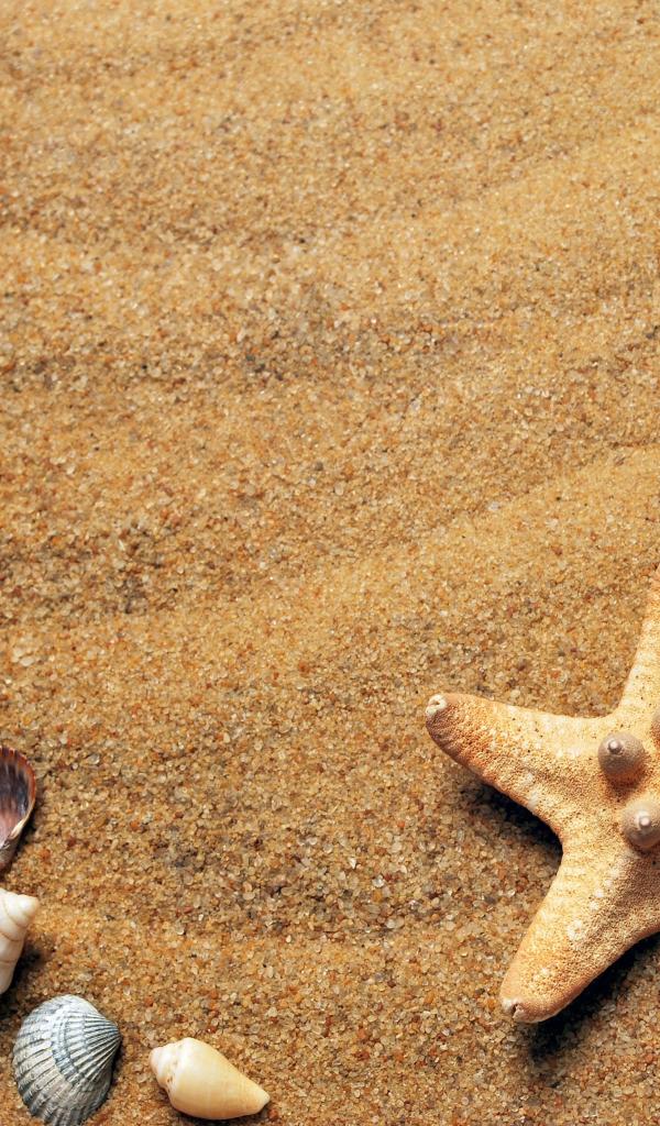 Wallpaper Starfish and seashells on the sand near the blue water of the sea